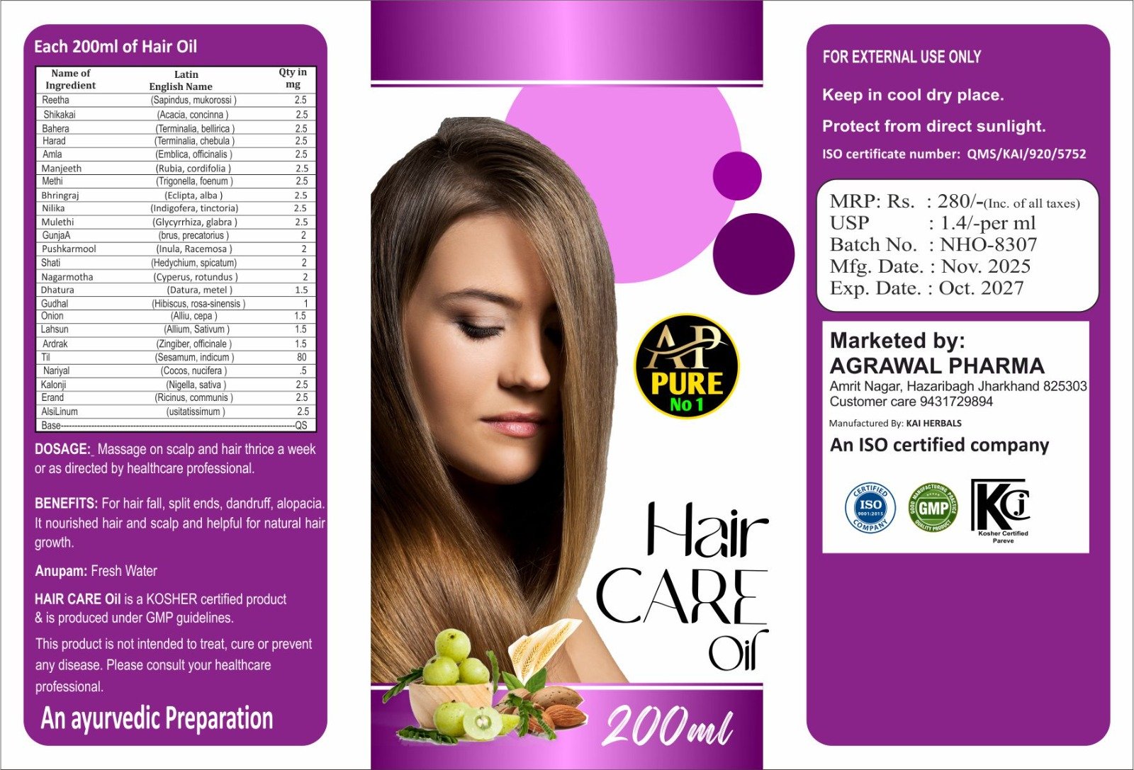 This hair oil helps reduce hair fall, dandruff, split ends, dryness, thinning, and supports healthier, shinier, and smoother hair. Suitable for all hair types, it is made under GMP-certified and Kosher guidelines, ensuring purity and quality.